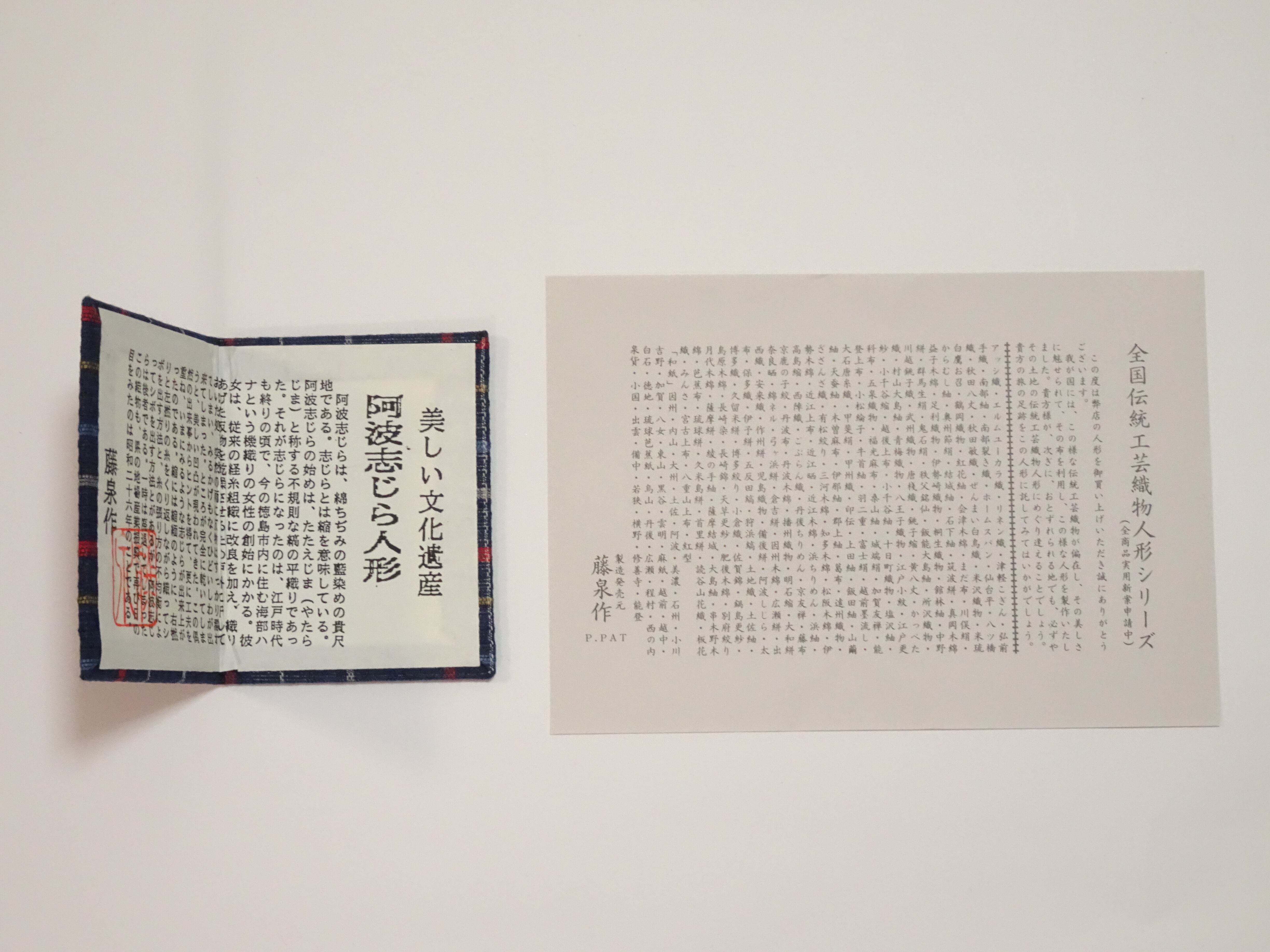 徳島県特産品である「阿波しじら織」で作られた人形のことで、特に木目込み人形が代表的です。阿波しじら織は、縦糸と横糸の張力差によって生まれる「シボ」と呼ばれる凹凸が特徴の木綿織物で、この素材を活かして作られた人形は、さらりとした肌触りと風合いが魅力です。